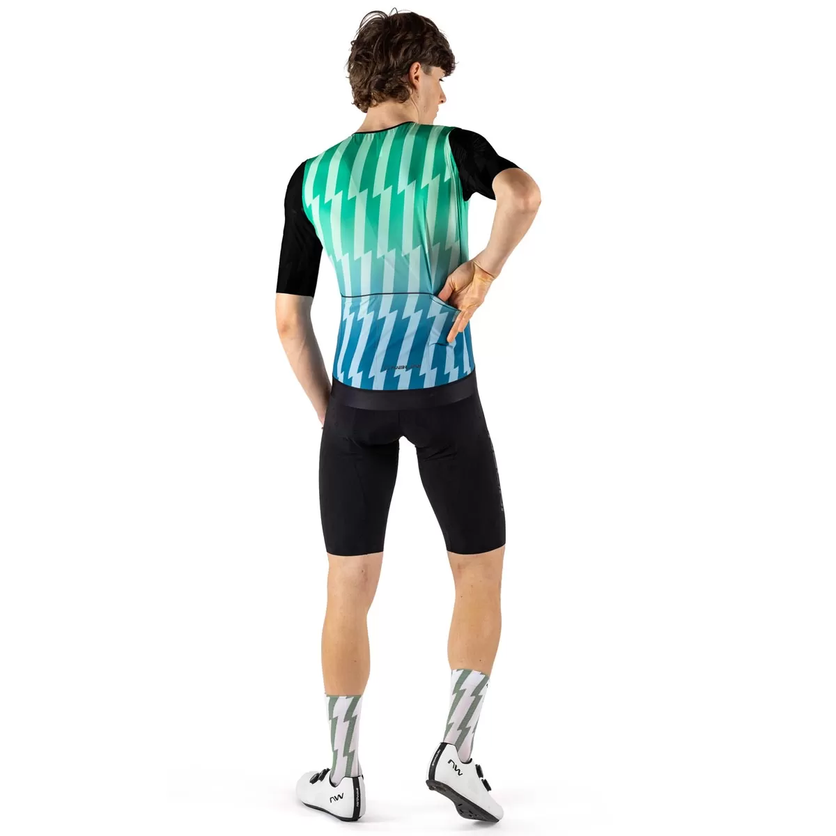 Le kit RAY est le fruit d'un processus de recherche mené en collaboration avec le CeRiSM (Centre de recherche sur le sport, la montagne et la santé) de l'université de Vérone, dans le but d'analyser et d'améliorer les réponses physiologiques de l'athlète pendant l'effort. Le résultat est un système complet composé d'un maillot, d'un pantalon et de chaussettes, conçu pour fonctionner en synergie avec le corps et soutenir les performances lors de séances à haute intensité.